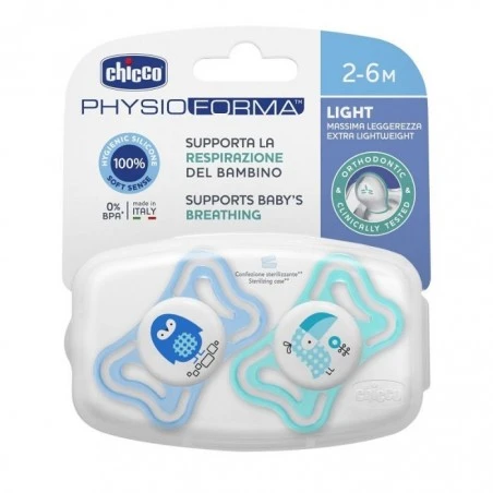 Il succhietto PhysioForma Light Chicco 2-6 mesi con tettarella in silicone è pensato per offrire al bambino la massima leggerezza unita ad un nuovo design. Il succhietto Chicco PhysioForma Light 2-6 mesi in silicone, grazie alla sua esclusiva forma, favorisce il corretto sviluppo della bocca e aiuta a posizionare la lingua in avanti supportando la respirazione fisiologica. Chicco PhysioForma Light 2-6 mesi è in silicone, materiale scelto per la sua praticità, igienico e indeformabile. L’esclusiva finitura Soft Tense lo rende morbido e vellutato.